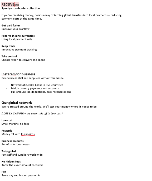 I worked as a Senior Copywriter at the foreign exchange firm NIUM - predominantly on their then consumer brand InstaRem - where I set up new tone of voice and editorial guidelines, and rewrote most of their customer communications.